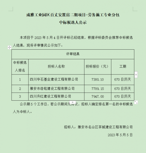 成雅工業園區百丈安置房二期項目-勞務施工專業分包中標候選人公示